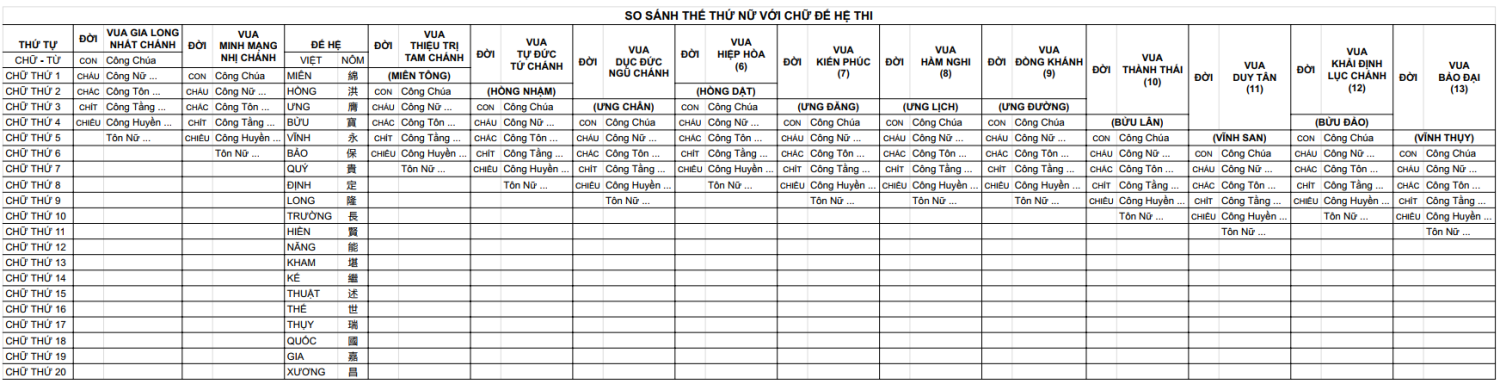 Kính thưa bà con và quý thân hữu yêu mến dòng họ Nguyễn Phước: Vừa qua, Bảo Kỳ thực hiện bảng SO SÁNH THẾ THỨ CHỮ ĐẾ HỆ THI VÀ CHỮ 10 BÀI PHIÊN HỆ THI đã nhận được nhiều ý kiến góp ý bổ sung và khích lệ. Nay Bảo Kỳ làm tiếp tục Bảng SO SÁNH THẾ THỨ NỮ VỚI CHỮ ĐẾ HỆ THI.Một số bà con nghĩ Công tôn, Công tằng v.v... là một họ, nhưng thực chất chỉ là một danh vị, như con gái Hoàng đế là Công chúa thế thôi.